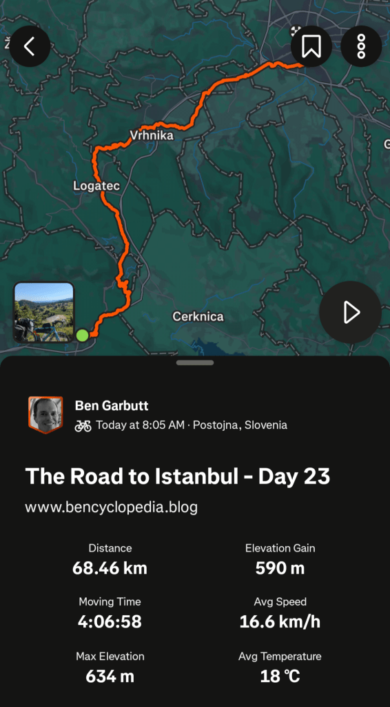 I started riding too early. Couldn’t help it, it’s now ingrained to be up and at ’em. But as usual Slovenia threw up beautiful vistas at every stage. Difficult to overstate the contrast of the emerald pastures and azure sky.