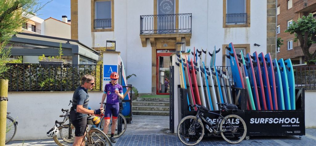 Bilbao to Zarautz, 100km. Started in early morning fog, soon to burn off. We followed the path of the Camino del Norte out of Bilbao and into Guernica, passing numerous pilgrims heading the other way through heavily wooded and often deeply muddy paths. From there the coast road and gravel tracks took us through lots of fishing towns, seemingly all having their own little festivals. Some severe climbs followed, too steep and tricky to even think about riding. But we made it to Zarautz by late afternoon, ready for a shower and a cold beverage.