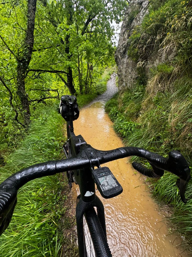 The highest point of the day was also ominous as we could see the storm clouds gathering. Sure enough on the descent a biblical storm of hail and rain hit. Our track became a river and we had to dismount to walk sections.