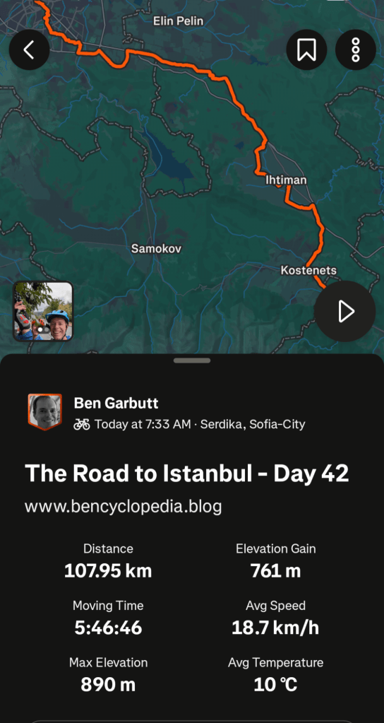Tomorrow we will ride to Plovdiv, Bulgaria’s second city, and an archeological gem apparently, with Roman ruins.