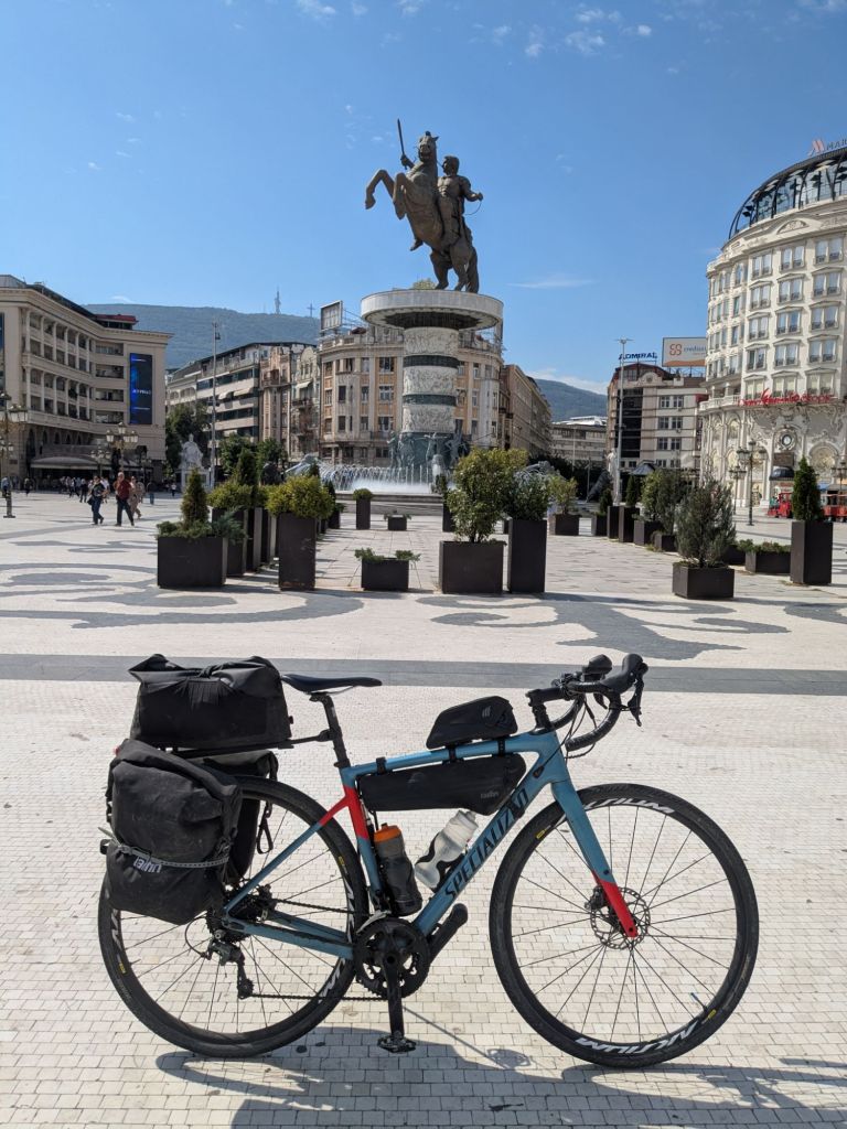 From there on it was one of my easiest rides, virtually all down hill! (I will pay for this tomorrow, mind). I covered off the 100km by midday and arrived in the impressive central square in Skopje in great time to look around.