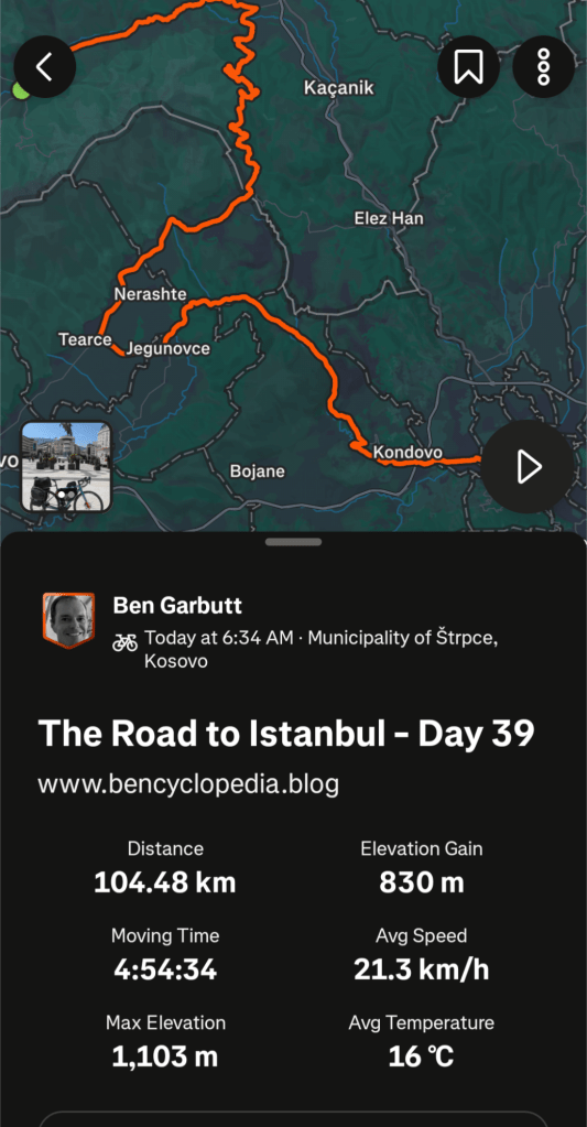 I was up and out in the drizzle early today, hoping to make it to Skopje in time to look around. First off – a relatively big climb (11km / 500m) to get up and over.