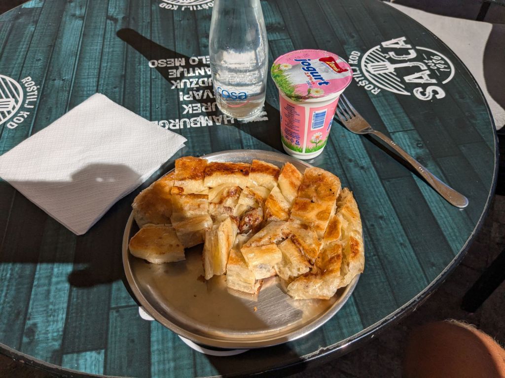 It got better quickly. Tutin was my lunch stop. I sat down at the best burek place in town and ordered. Quickly realising I’d spent all my Serbian cash I sprinted after the waiter and asked if it was ok to pay by card. Apparently not, but with a series of gestures and his few words of English he offered the meal for free. “You English? Cycle Serbia? Respect.”