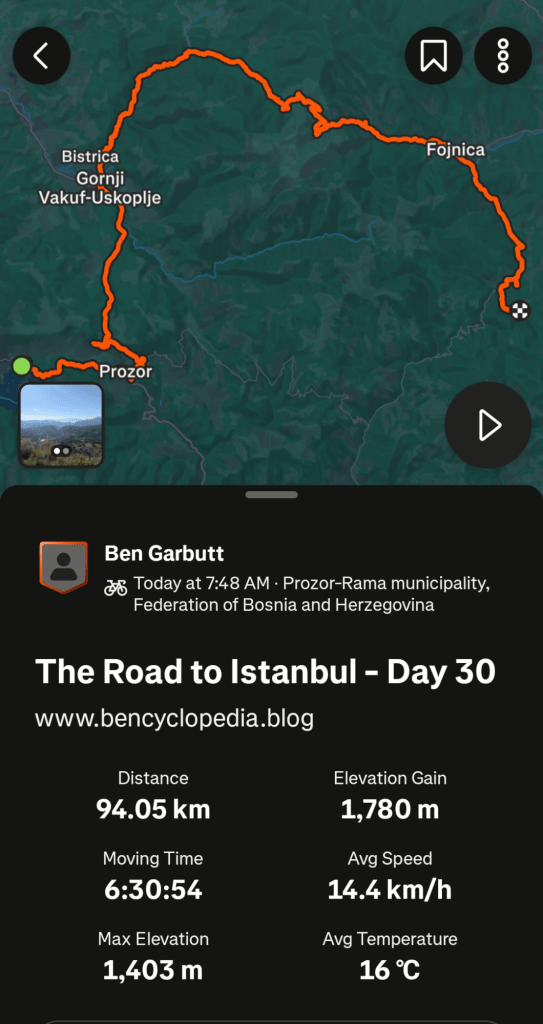 I took a short break in Gornji Vakuf to refuel. I’ve visited a few bakeries in Bosnia already. No burek yet! Perhaps bakeries don’t do them here. The language barrier means I just point at something and get a surprise. Will it be sweet or savoury? It barely matters when you’re constantly needing to refuel.