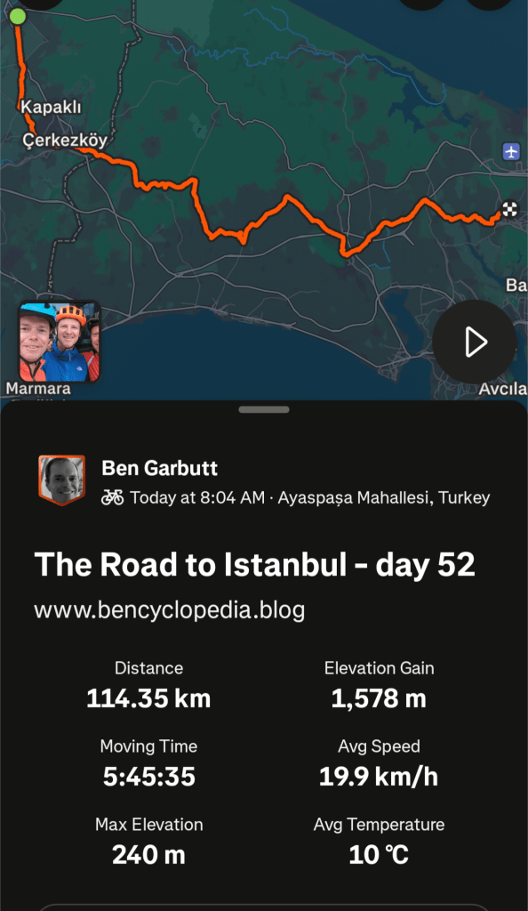 Tomorrow is the valedictory ride into Istanbul, not more than 30km from here – a quick roll in through the notorious traffic.