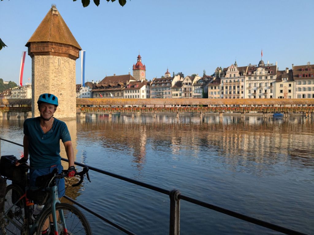 An epic day of changing scenery today. We started by pootling into Lucerne. If you could picture an idyllic Swiss town this would be it: a castle, a clear river spanned by centuries old bridges, grand hotels in chocolate box style and architecture straight out of Swiss caricatures. And at the end of it lies an azure lake.