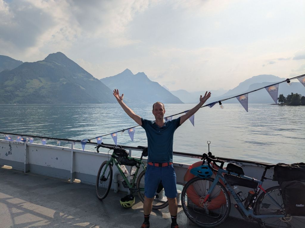 We rode the northern shore, pulling up to the ferry point just as one arrived, then drank in the views of the mountains plunging into the water. Swimmers, kayakers, yachties, paddle boarders – they were all out. And above, parascenders drifted gently down.
