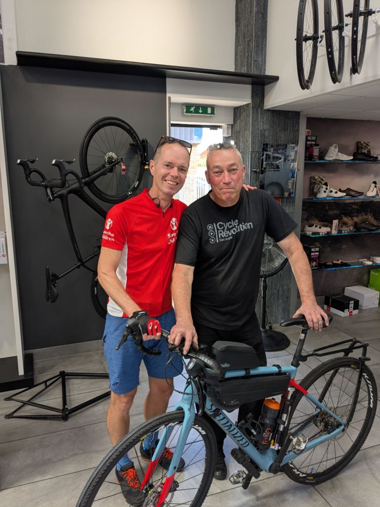 I felt a minor pull in my gears at Colchester so stopped at a bike shop. So much for the expensive service I had arranged prior to leaving – the front gear cable was severely frayed. Luckily the good people at Cycle Evolution had it changed before we finished our DIY lunch on the pavement outside.